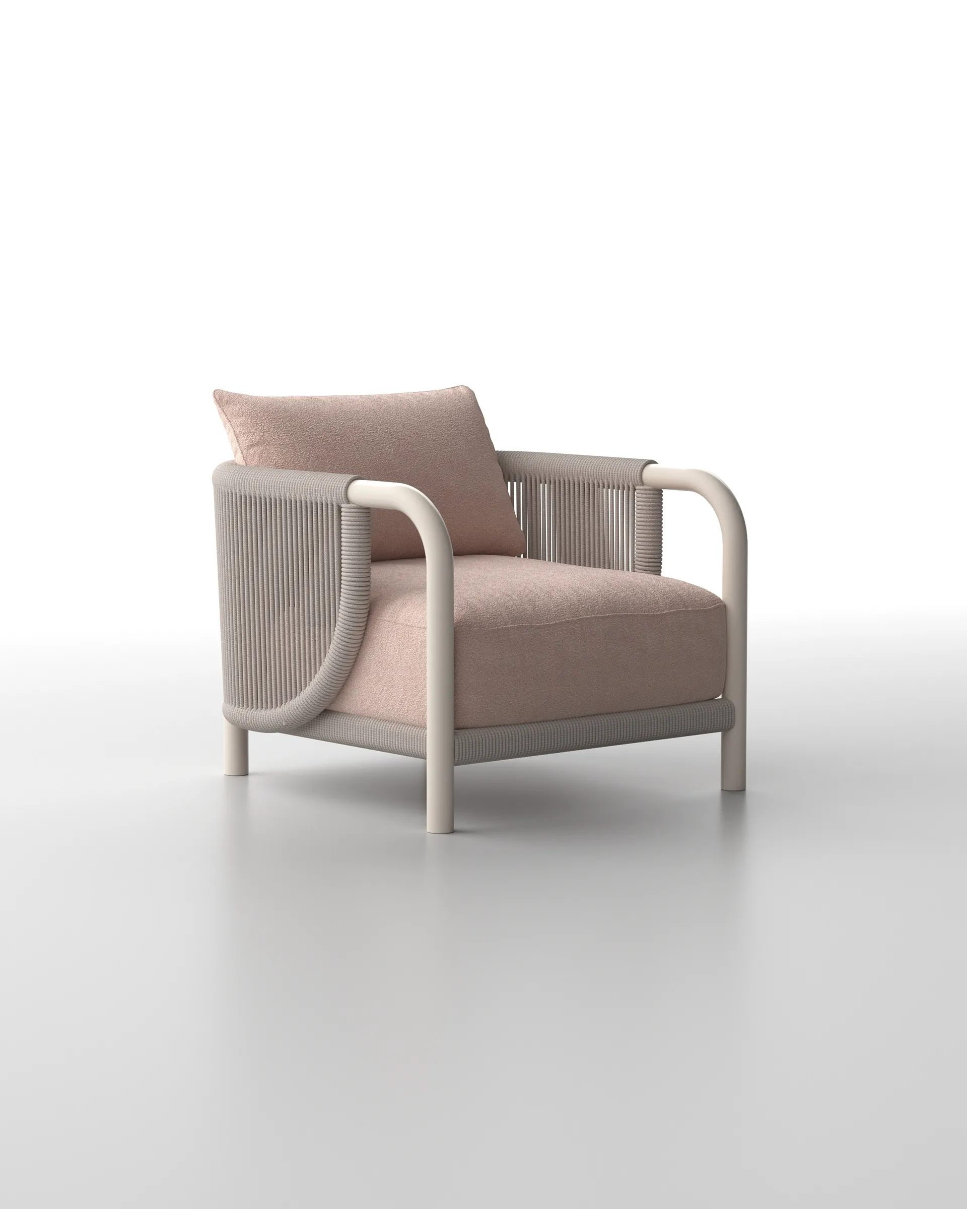 With aluminum wood frames, mixed with an enveloping rope that both covers the base of the seat and wraps the perimeter of all the pieces at the backrest and arms, this collection owes its name, ARC, to the most characteristic gesture of its design, the arc traced by the roping on the sides of each piece.