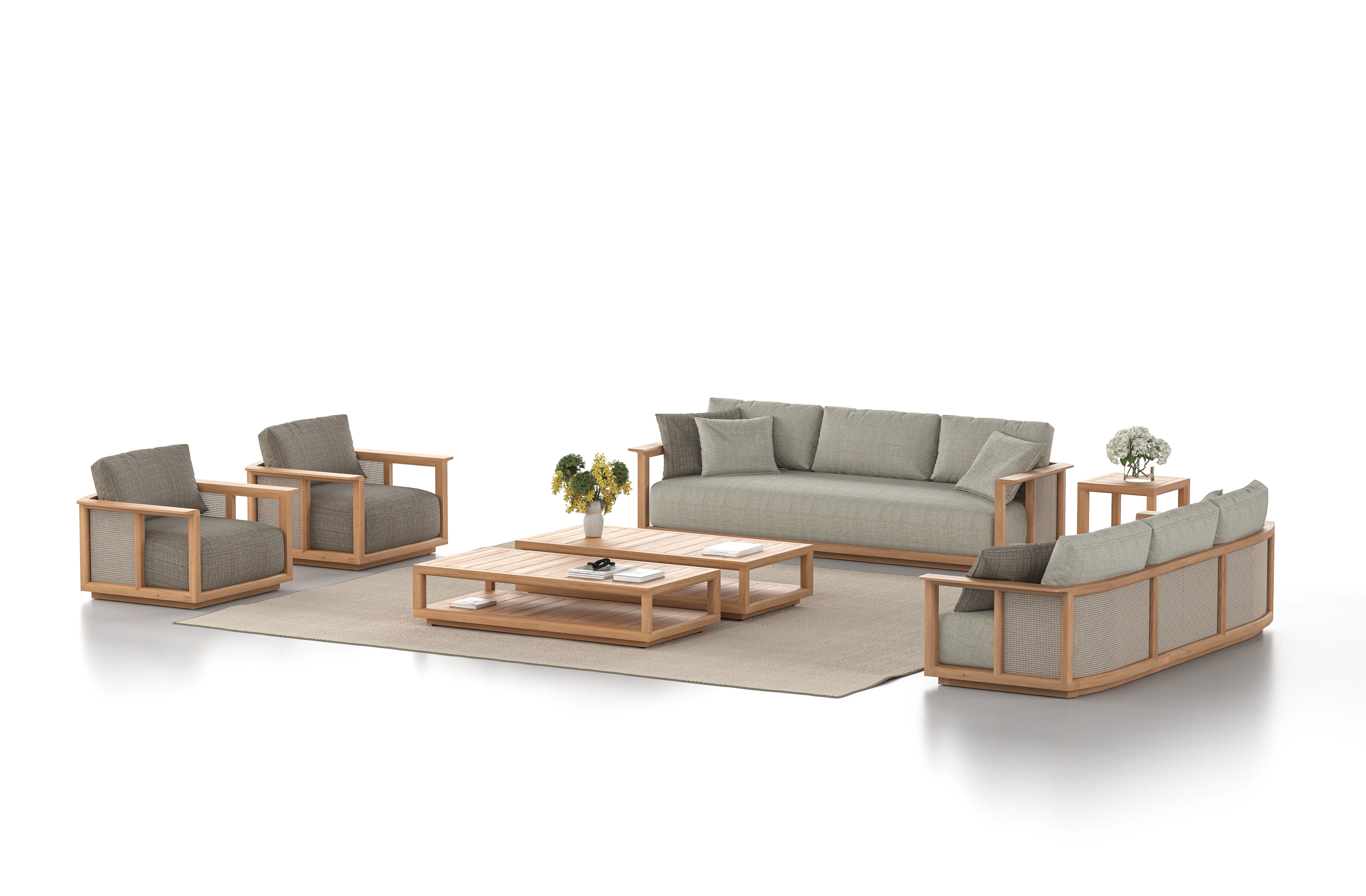 Nuance is an outdoor collection created with the intention of blending simplicity and elegance through what we call soft-geometric design. All the elements of the collection feature a strong geometric wooden frame, whose rigidity is softened by a distinctive rounded back and Serif-like armrests. At its core lies the concept of open-closed transparency, brought to life through woven panels that allow light and air to pass through while preserving a sense of privacy and structure. These features come together to shape Nuance’s distinctive aesthetic, making it both comfortable and instantly recognizable.