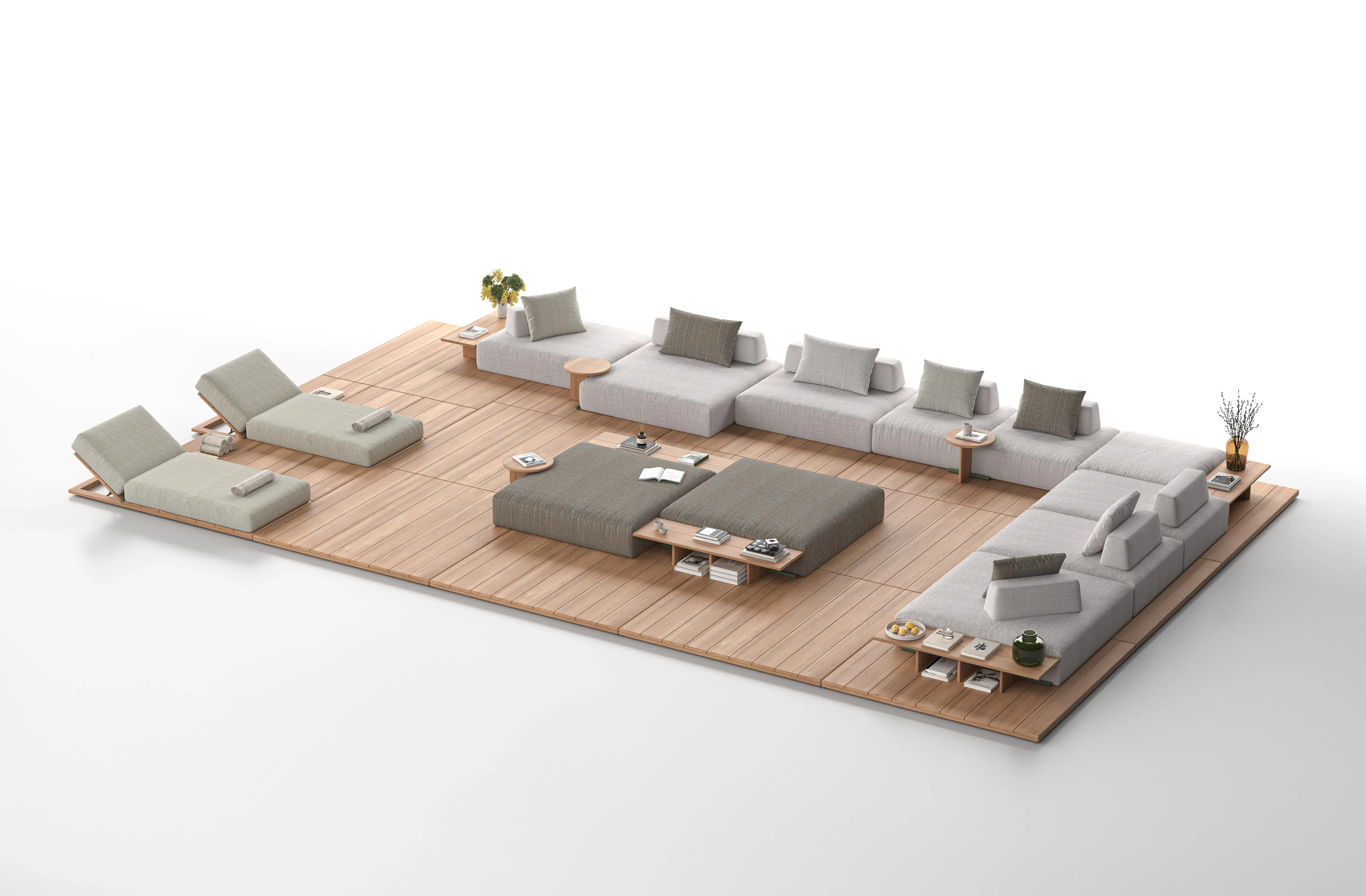 Tangram is a modular outdoor furniture collection inspired by the namesake game. Its teak wood bases, available in different proportions, can be freely combined, allowing for versatile configurations that adapt to any space. Tangram transforms outdoor areas into dynamic, functional, and creative environments.