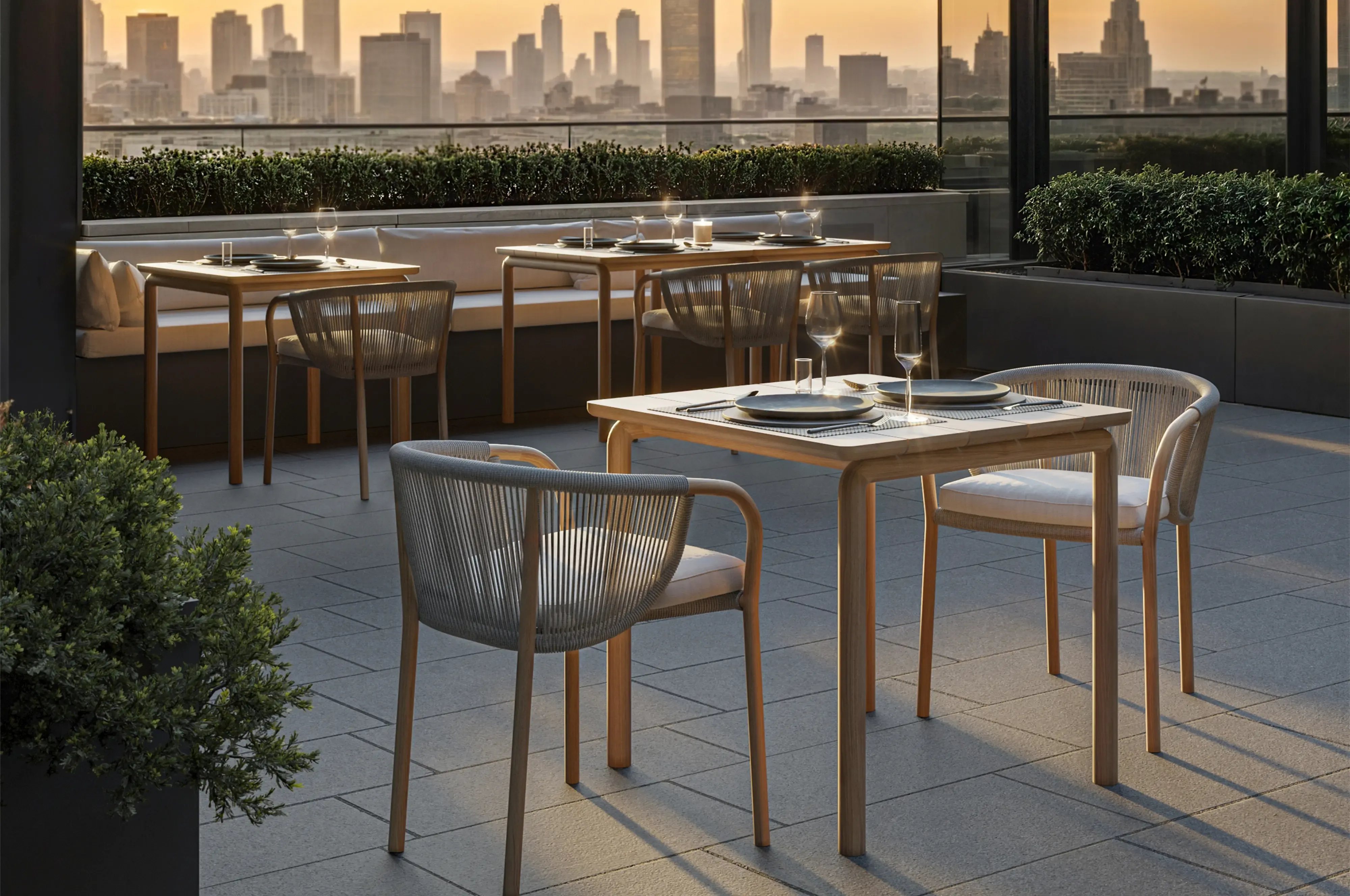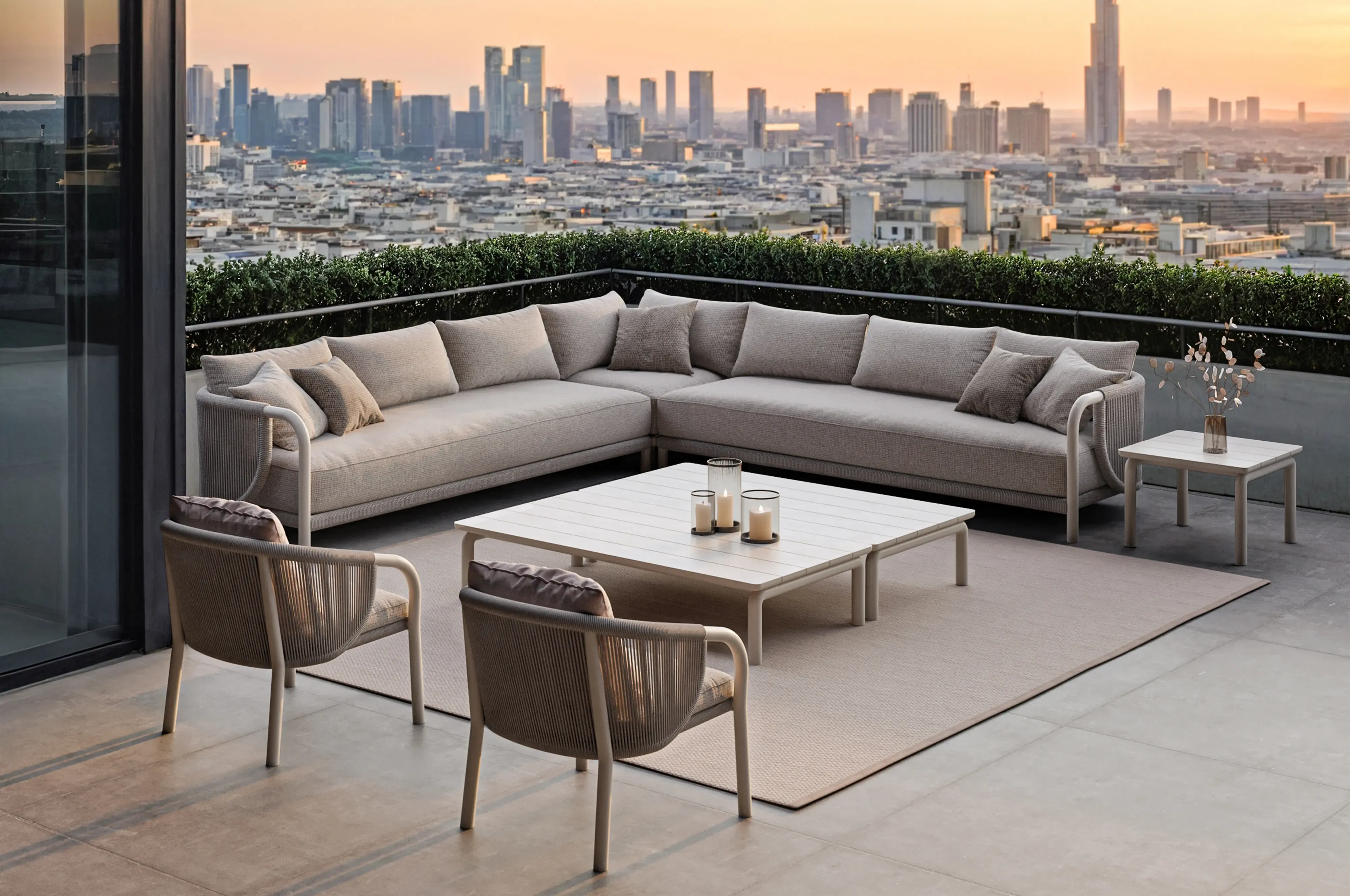 With teak wood frames, mixed with an enveloping rope that both covers the base of the seat and wraps the perimeter of all the pieces at the backrest and arms, this collection owes its name, ARC, to the most characteristic gesture of its design, the arc traced by the roping on the sides of each piece.